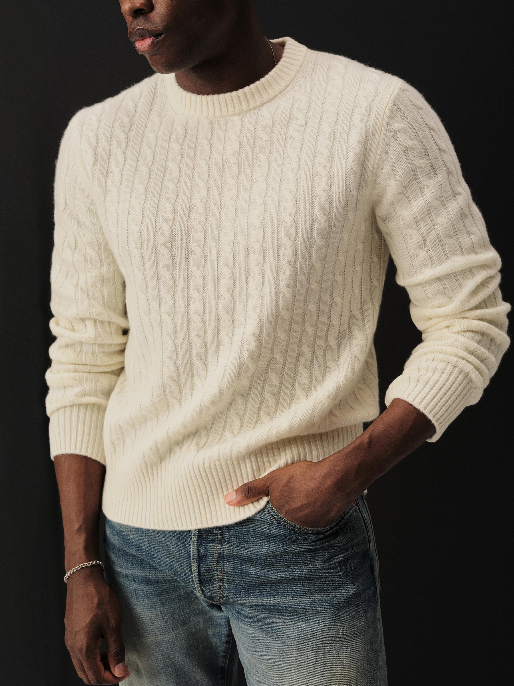 The California Cashmere Cable Crew is spun from 100% long-staple cashmere and knit in a refined 12-gauge cable pattern. Inspired by the casual poise of 1960s Ivy League sweaters, it’s finished with yarn-dyed ribbing at the neck, cuffs, and hem, and garment-rinsed for a soft, lived-in feel.