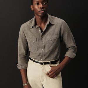 Classic fit button down collar shirt cut from a proprietary 3 oz blend of cotton and tencel. Details include mother of pearl buttons, a single scallop pocket, and a box pleat at the back. Constructed with clean finished seams. Garment washed for a lived-in look and feel.