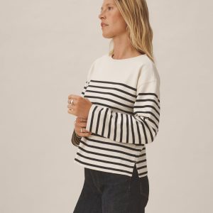 Relaxed long sleeve boatneck tee inspired by the classic French breton shirts. Cut from sturdy, compact 350 GSM cotton. Details include a taped boatneck neckline and side slits at the hem. Constructed with flatlock stitching throughout and double needle coverstitching at the hem. Garment washed for a lived-in feel.