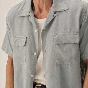 Classic fit short sleeve camp shirt cut from a 5.25 oz. yarn-dyed linen blend with a subtle luster and relaxed drape. Features a six-button placket with mother of pearl buttons, twin patch-and-flap chest pockets, straight hem, and a loop and button closure at the neck. Constructed with clean finished seams. Garment washed with enzymes for a lived-in feel.