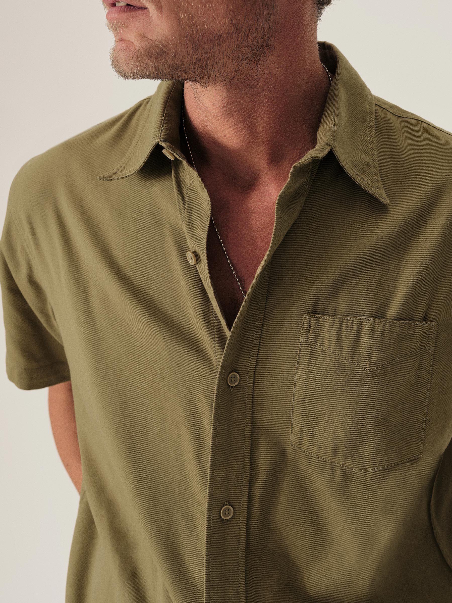Roomy up top and slim through the body, this lightweight short sleeve button up has a relaxed drape. A casual classic featuring shell buttons and a mid-length hem that looks great tucked or untucked.