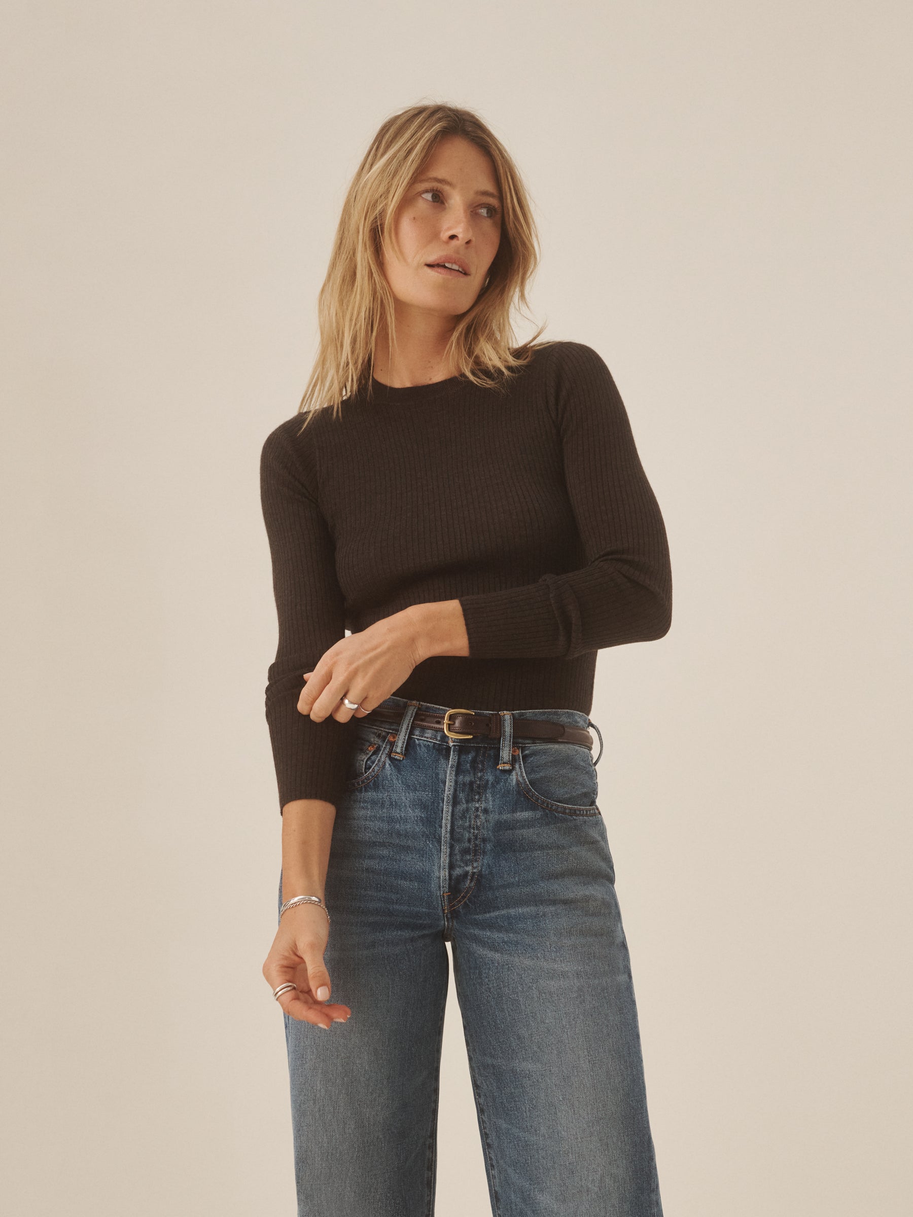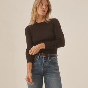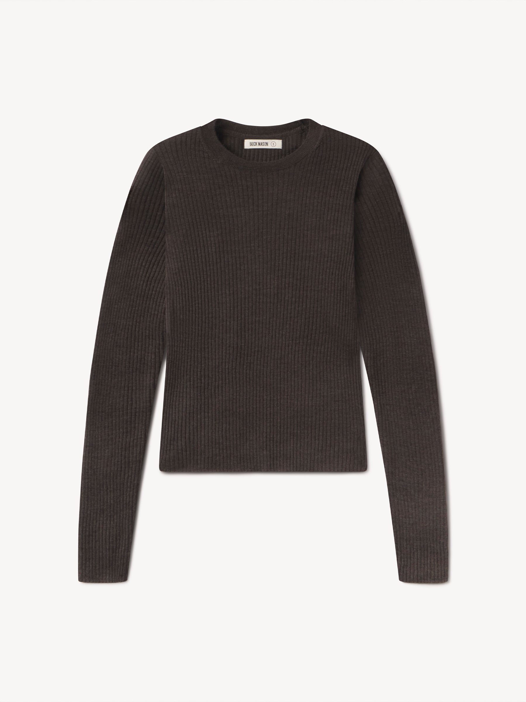 Slim fit crewneck sweater in a 24″” length, elevated in a 14 gauge variegated rib knit from a blend of merino wool, silk, and cashmere. Luxe, easy, and ideal for layering. Constructed with self-starting hem and sleeve trim and fashioning at the neckline and back shoulder for durability.