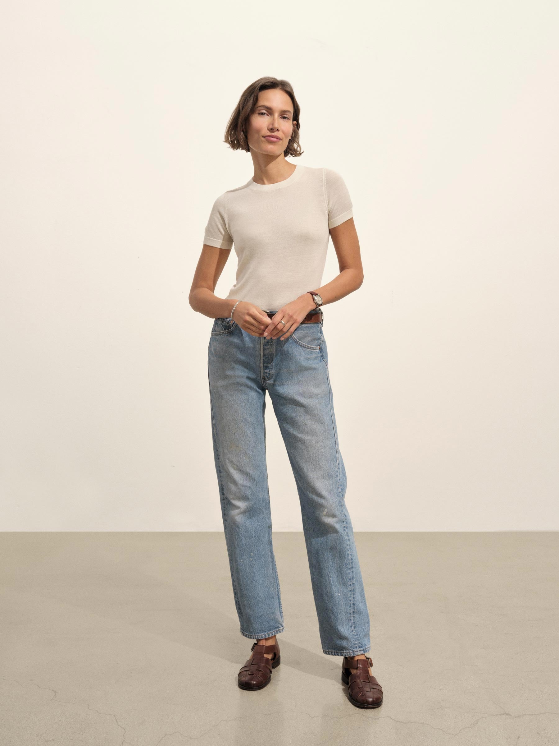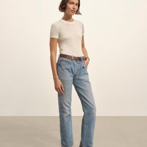 Crewneck sweater knit tee with a relaxed, slim fit. Spun from a yarn-dyed blend of merino wool, silk, and cashmere. Garment washed for added softness.