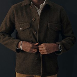Classic fit field shirt in 340 GSM felted merino wool, twice boiled for improved insulation and durability. Details include patch-and-flap chest pockets and a button front closure. Constructed with hand-sewn facings and cover-stitching with flat seams for comfort.