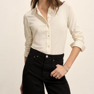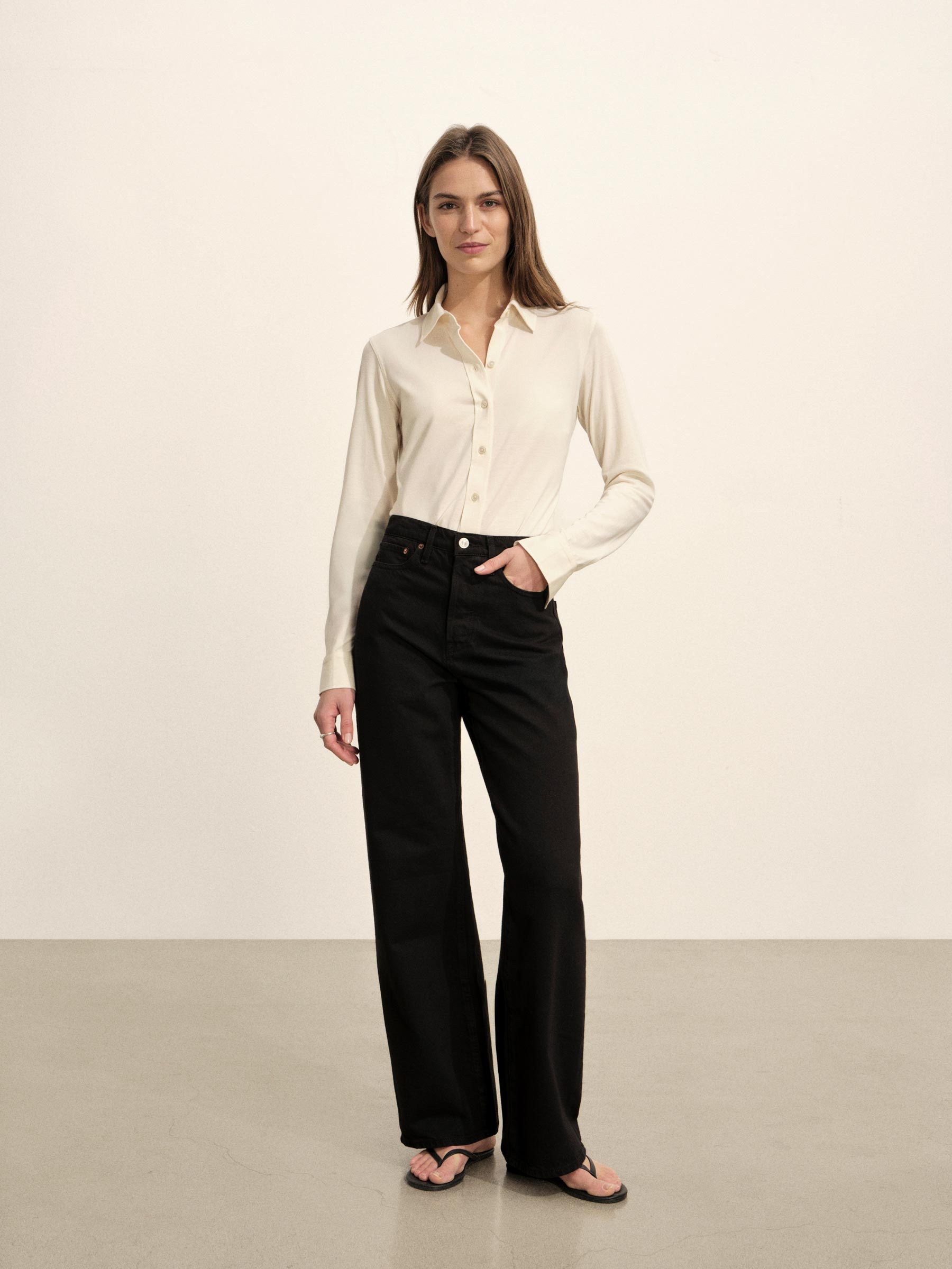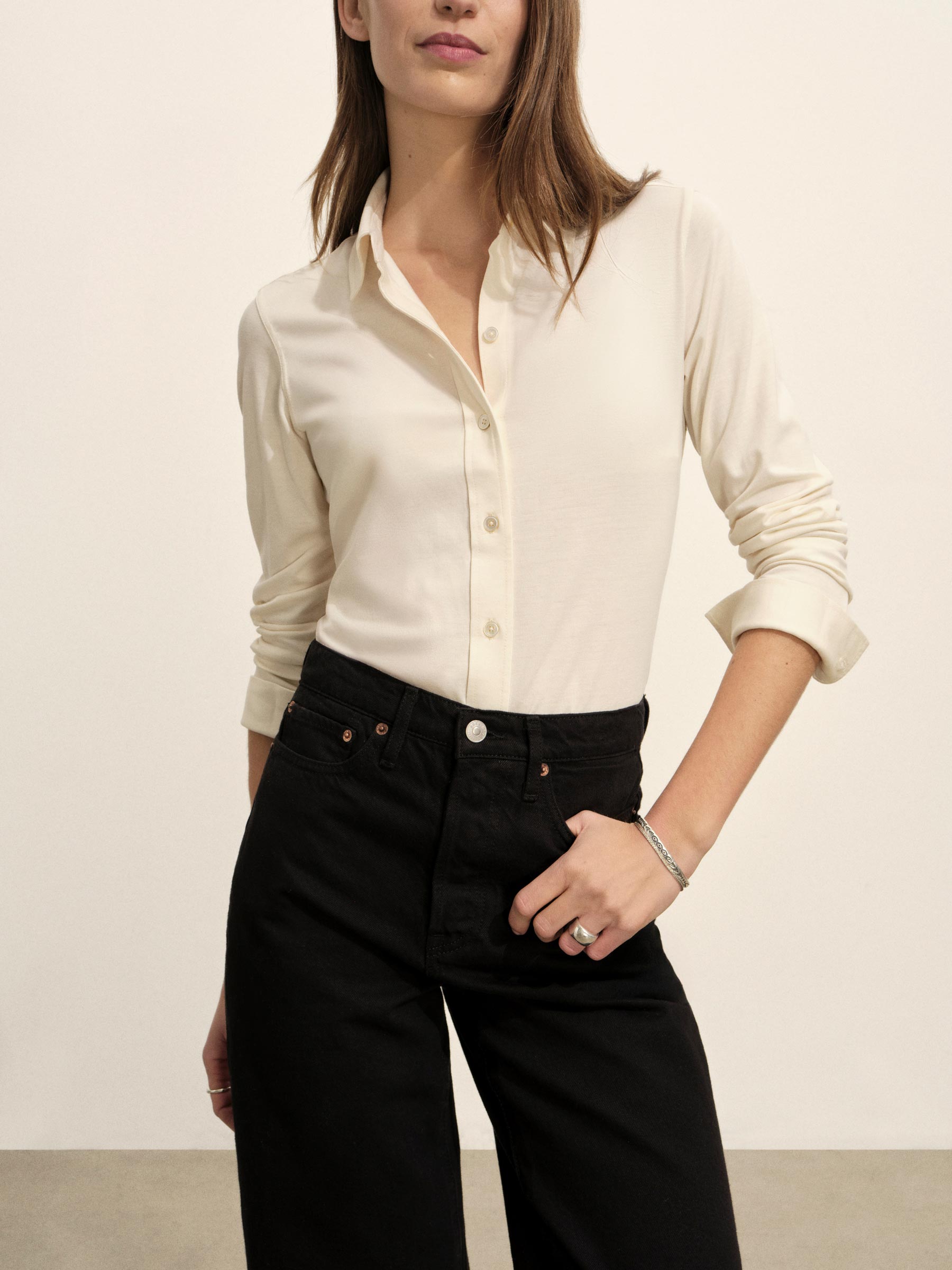 Silky, relaxed slim-fit jersey-knit button-down crafted from a blend of EcoCell and Pima cotton, featuring a collar backed with combo jersey and buttoned sleeve openings. Garment washed for an authentic vintage hand feel and finished with mother of pearl buttons.