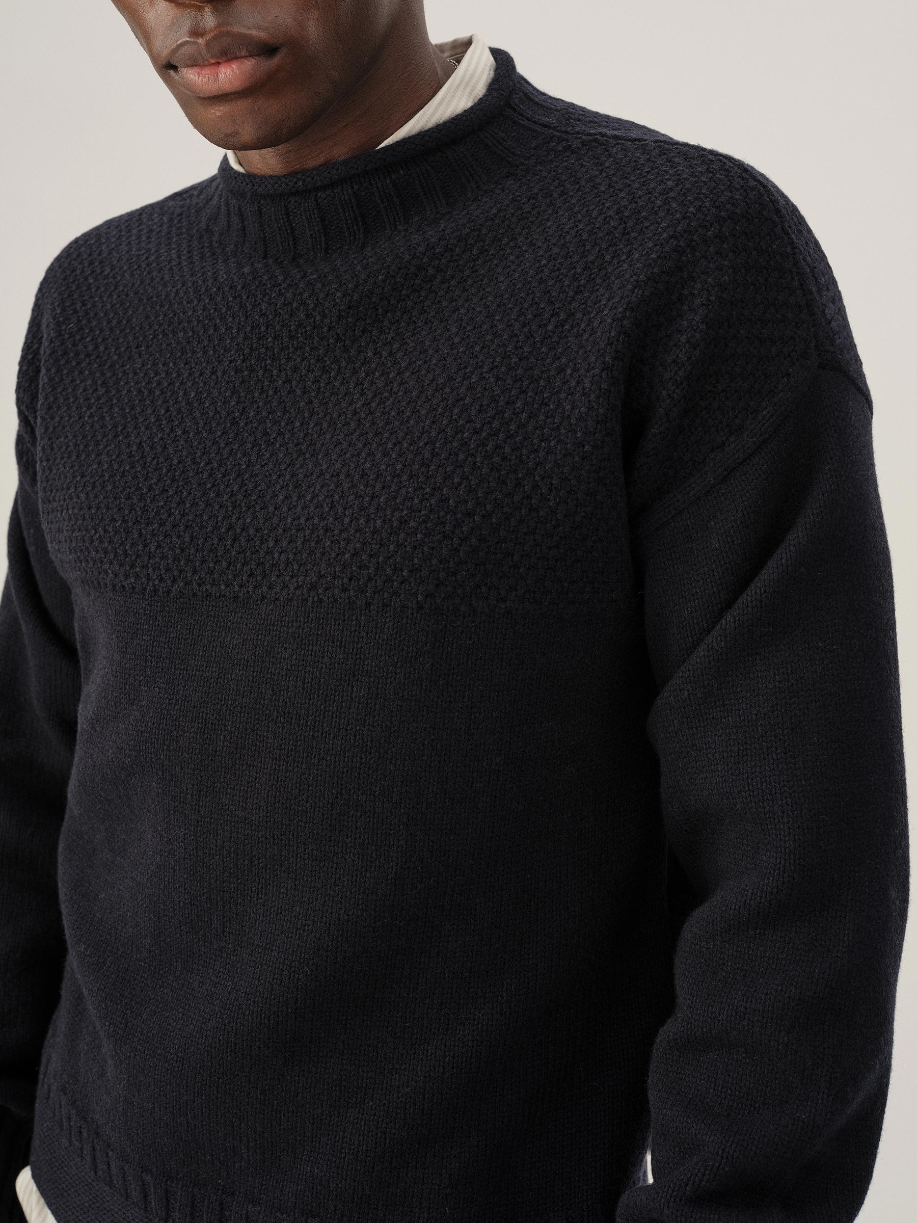 A nod to traditional fishman styles and workwear knits from the 1600s, our Guernsey Rollneck features a relaxed, slightly cropped fit in a comfortable 100% merino wool. Moss stitch upper body with rib finishes at cuffs and collar. Jersey roll at collar top edge with a garter stitch hem.