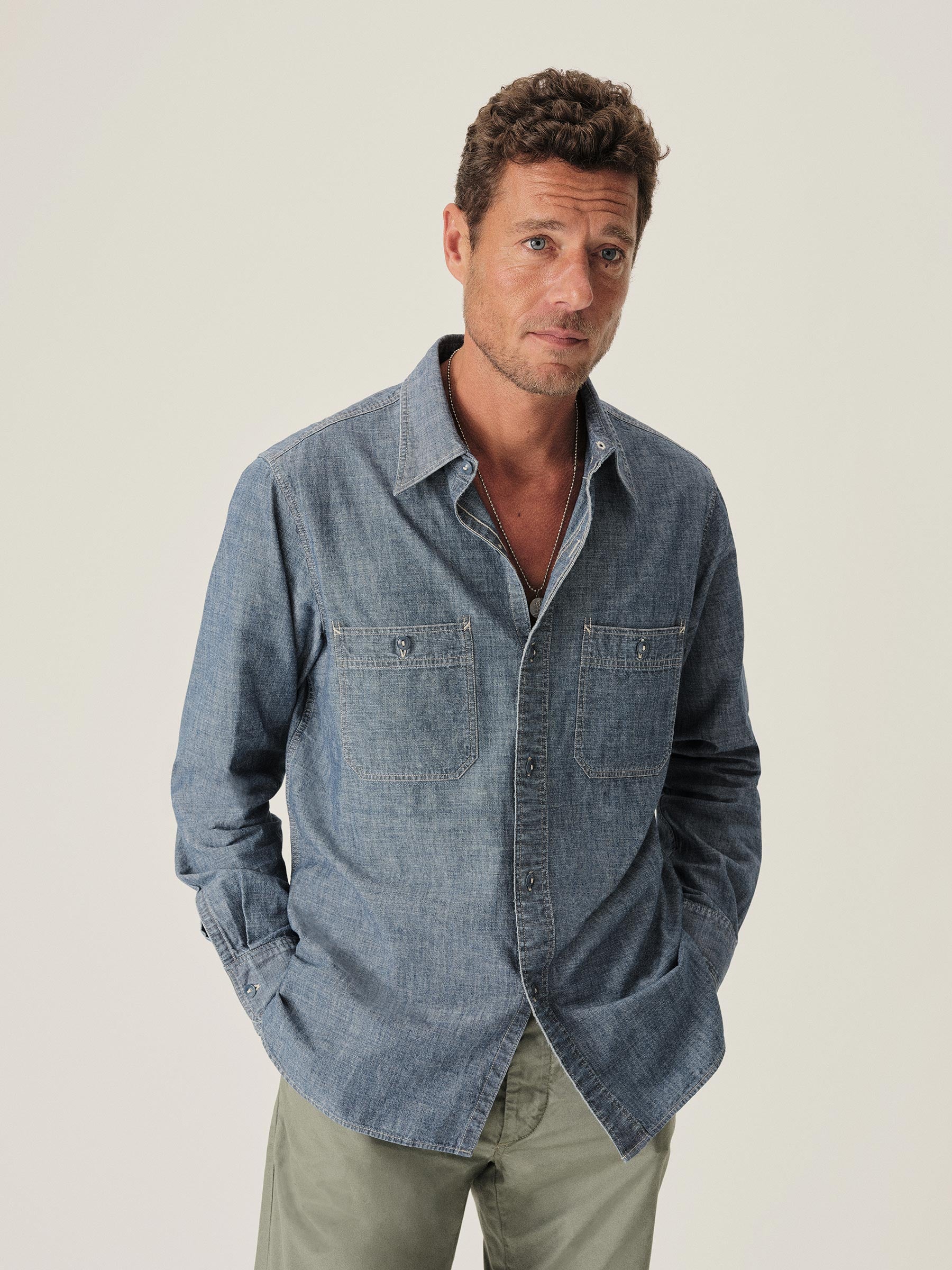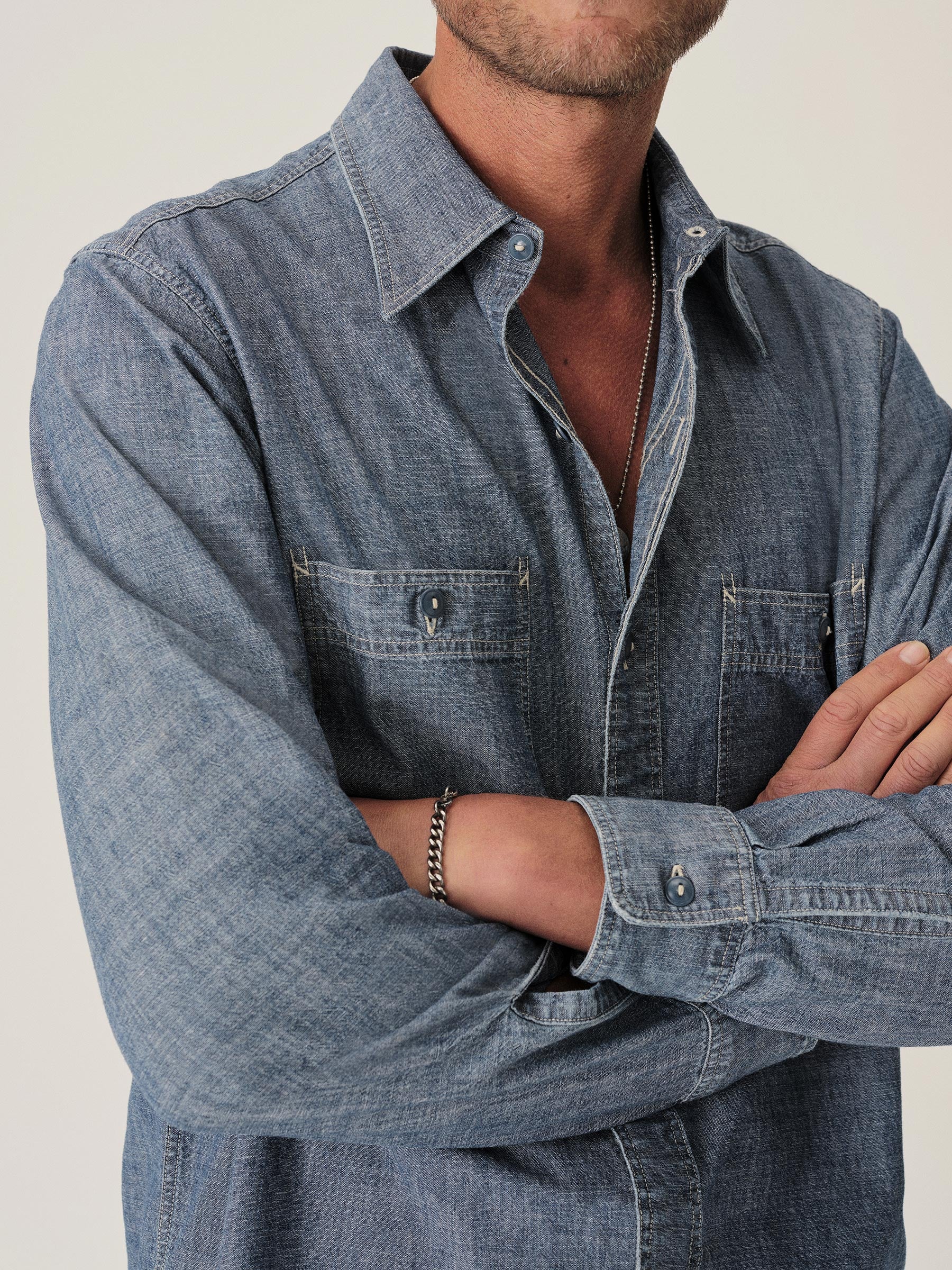 Classic fit work shirt cut from 5 oz indigo yarn-dyed chambray. Details include tonal buttons, two chest pockets, and run off stitching at the side gussets. Constructed with clean finished seams. Garment washed for a lived-in look and feel.