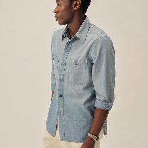 Classic fit work shirt cut from 5 oz indigo yarn-dyed chambray. Details include tonal buttons, two chest pockets, and run off stitching at the side gussets. Constructed with clean finished seams. Garment washed for a lived-in look and feel.