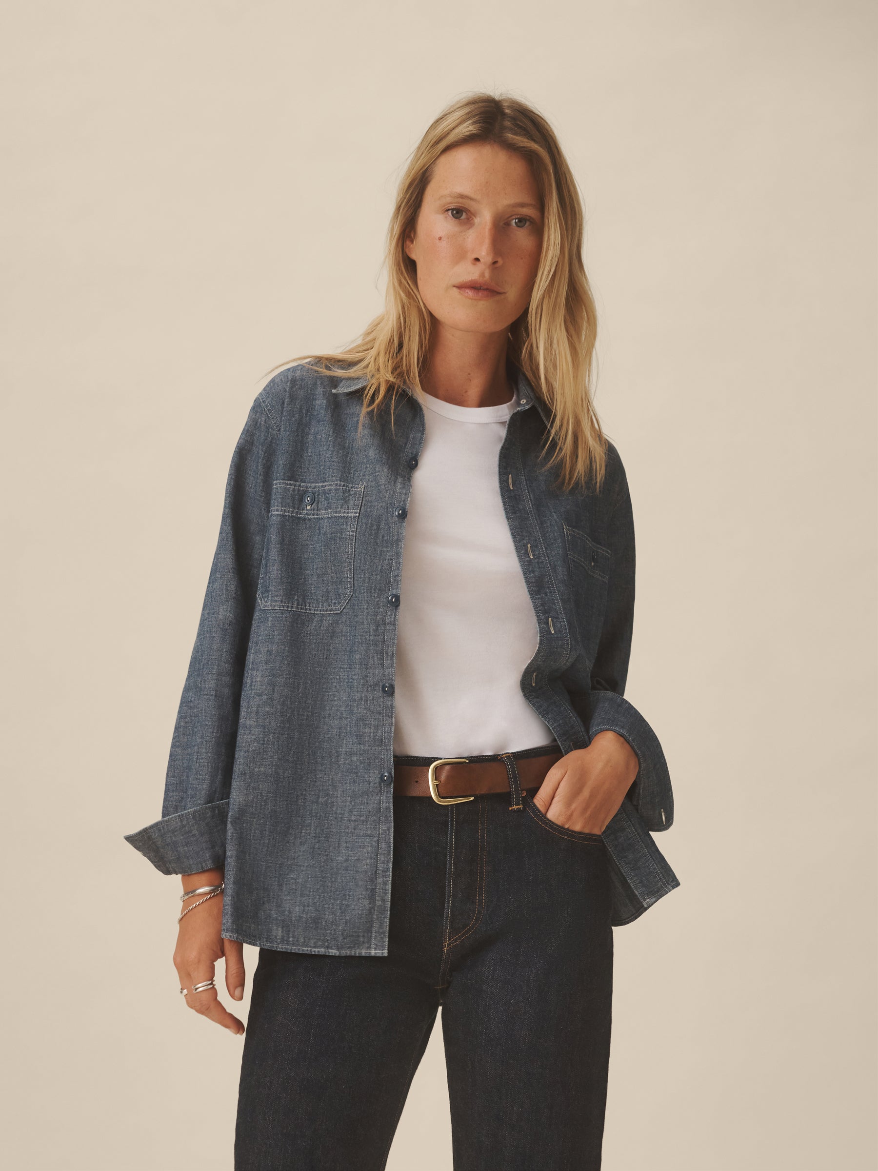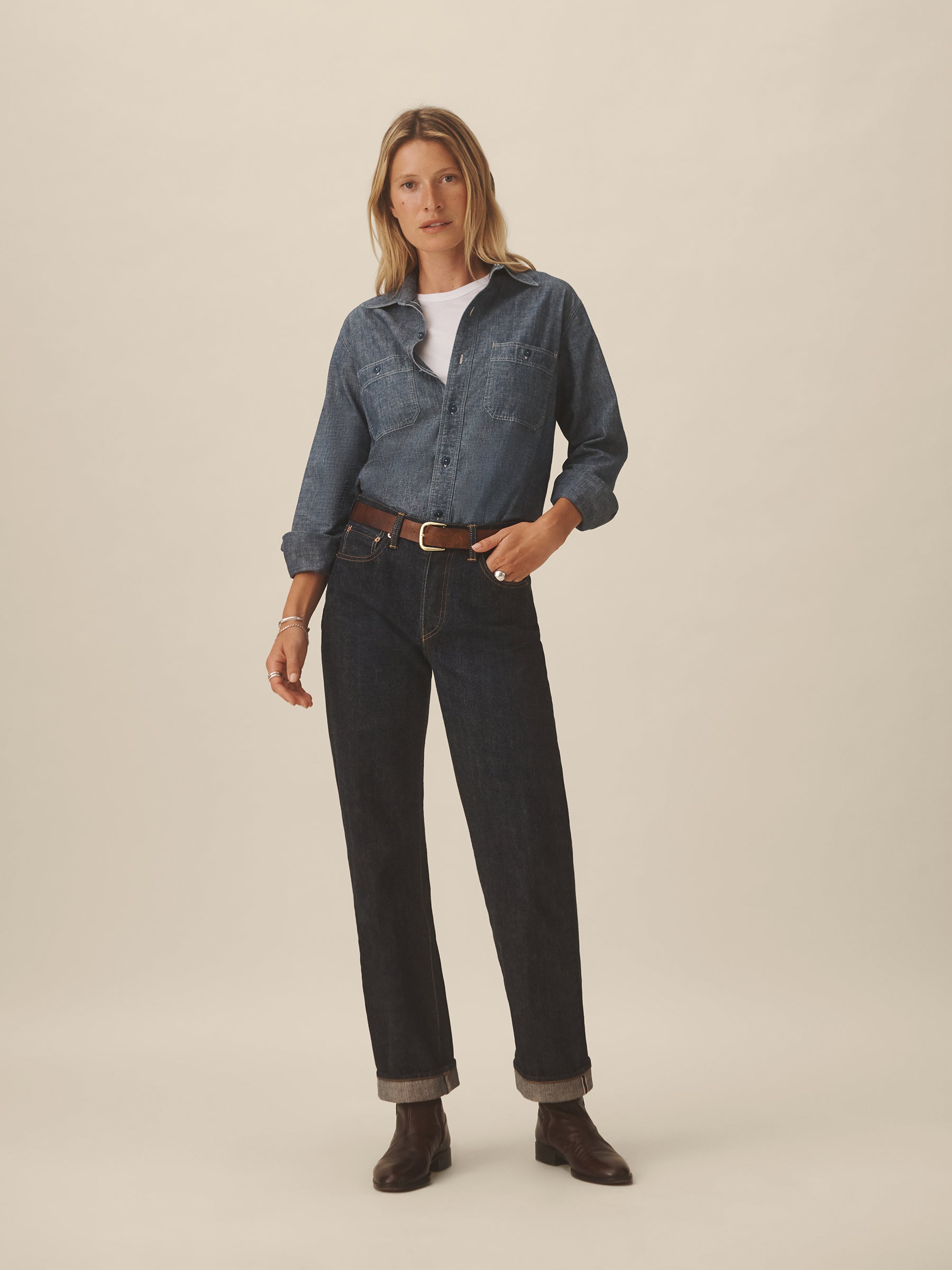 A work shirt cut from lightweight, yarn-dyed Japanese chambray. Modeled after 1950s workwear styles, it’s constructed with twin button-through chest pockets, durable felled seams, tonal 2-hole poly workwear buttons, and run-off stitching at the side gussets. Reinforced with discreet bartacks throughout.