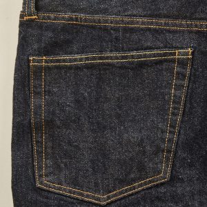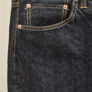 A classic 5-pocket jean in our Cowboy fit: Slightly higher rise with a tailored fit through the thigh and leg. Inspired by blue jeans from the 1940s through the 1960s, this shuttle loomed 14 oz. selvedge denim is unsanforized, and has an organic texture that develops more character with every wear. Garment rinsed for a lived-in feel. Details include copper rivets and a metal tack button fly.