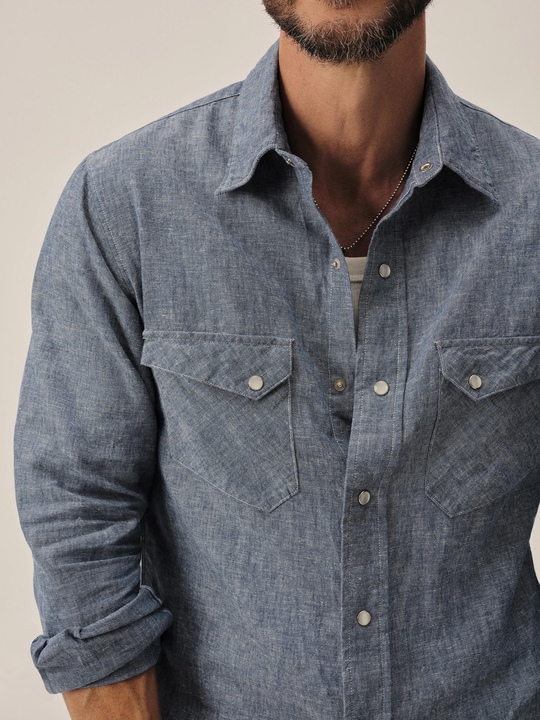 In the style of the 1940s, a classic fit western with no front yokes that lends itself to a more tailored style of dress, cut from a yarn-dyed blend of breezy linen and cotton. Featuring slanted pocket flaps, a pointed back yoke, and snap button fasteners.