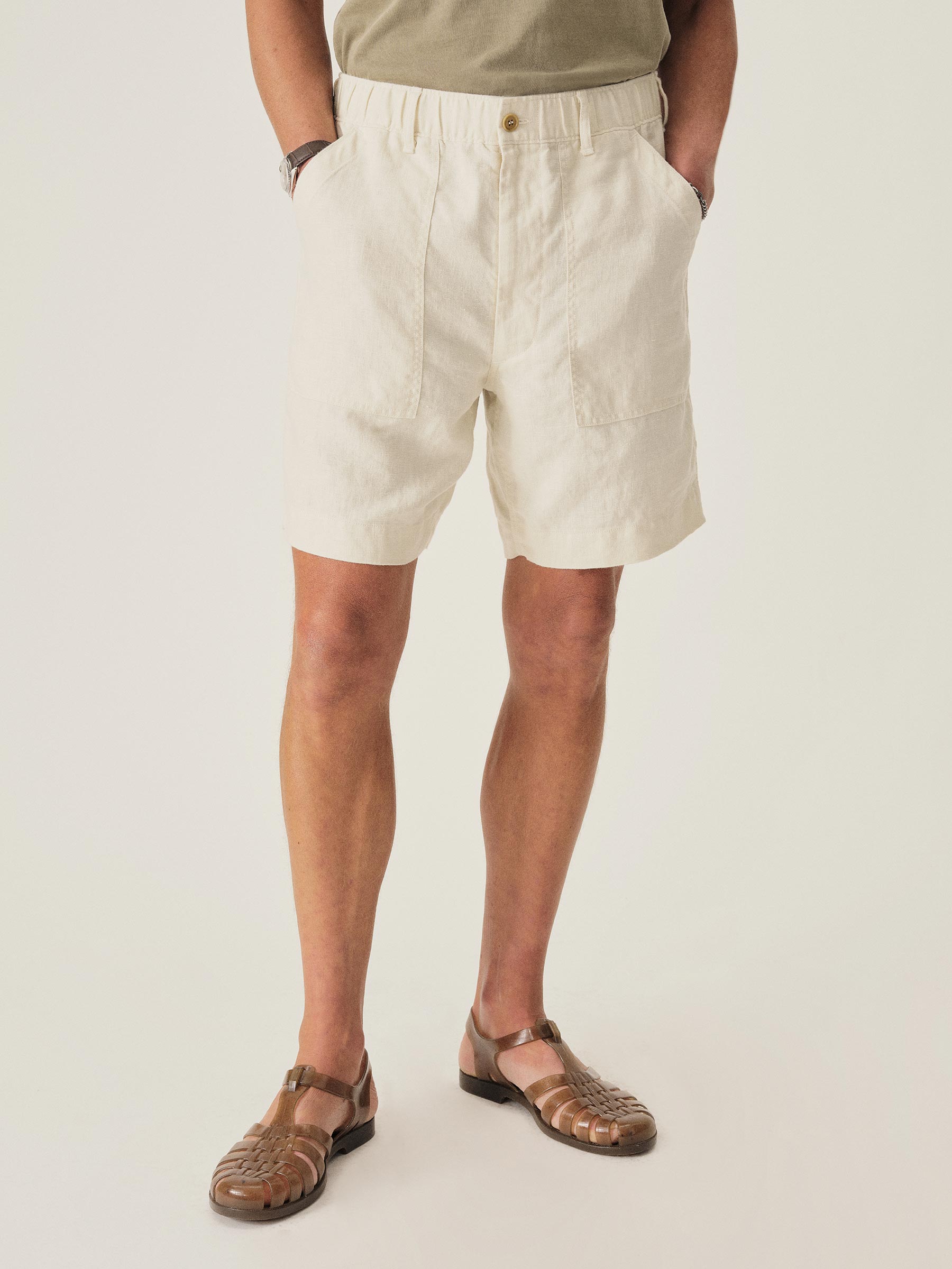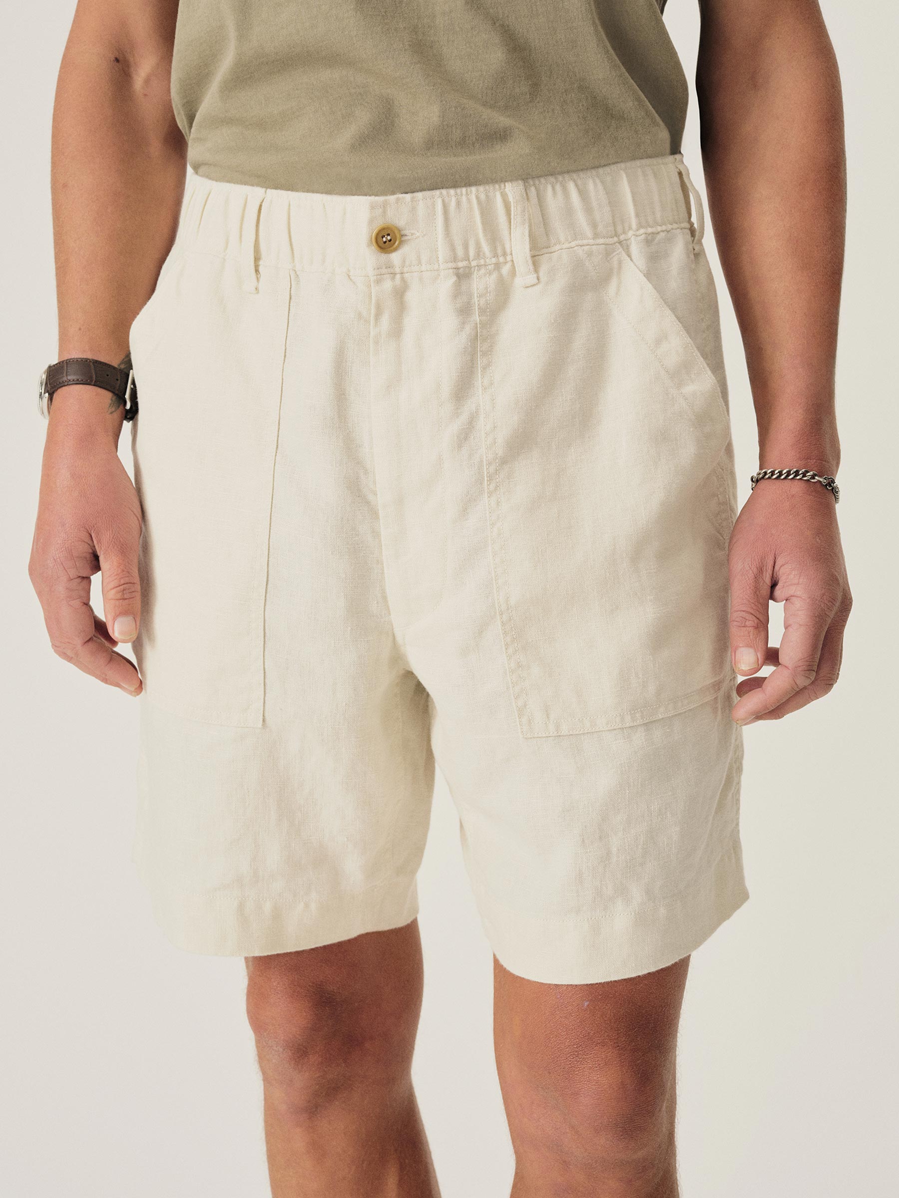 Classic fit fatigue short. This 7 oz. linen has a loose, airy weave that breathes easily, and it’s been washed for a lived-in feel. Details include two front patch pockets, two back patch pockets, an encased elastic waist with drawcord, and corozo buttons. Garment washed with enzymes and softener for a lived-in feel. Button and zip closure.