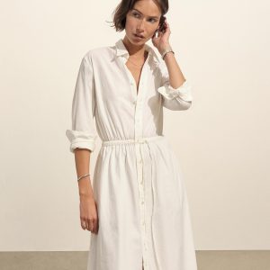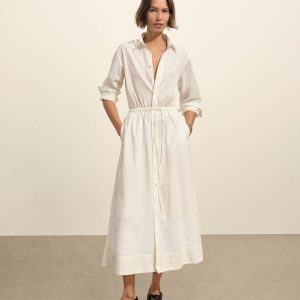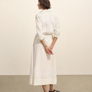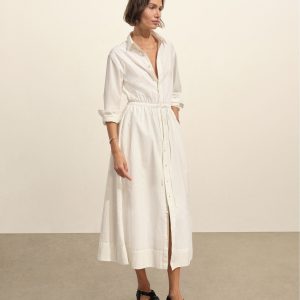 Our Mainstay Shirt reimagined in a maxi dress made from 2.8 oz. cotton plainweave. Featuring a back yoke with a box pleat, a lined skirt, and knife-pleated sleeve cuffs with vents. Finished with elastic ties at the waist for a custom fit and mother of pearl buttons at the placket. Garment washed for a livid-in feel.