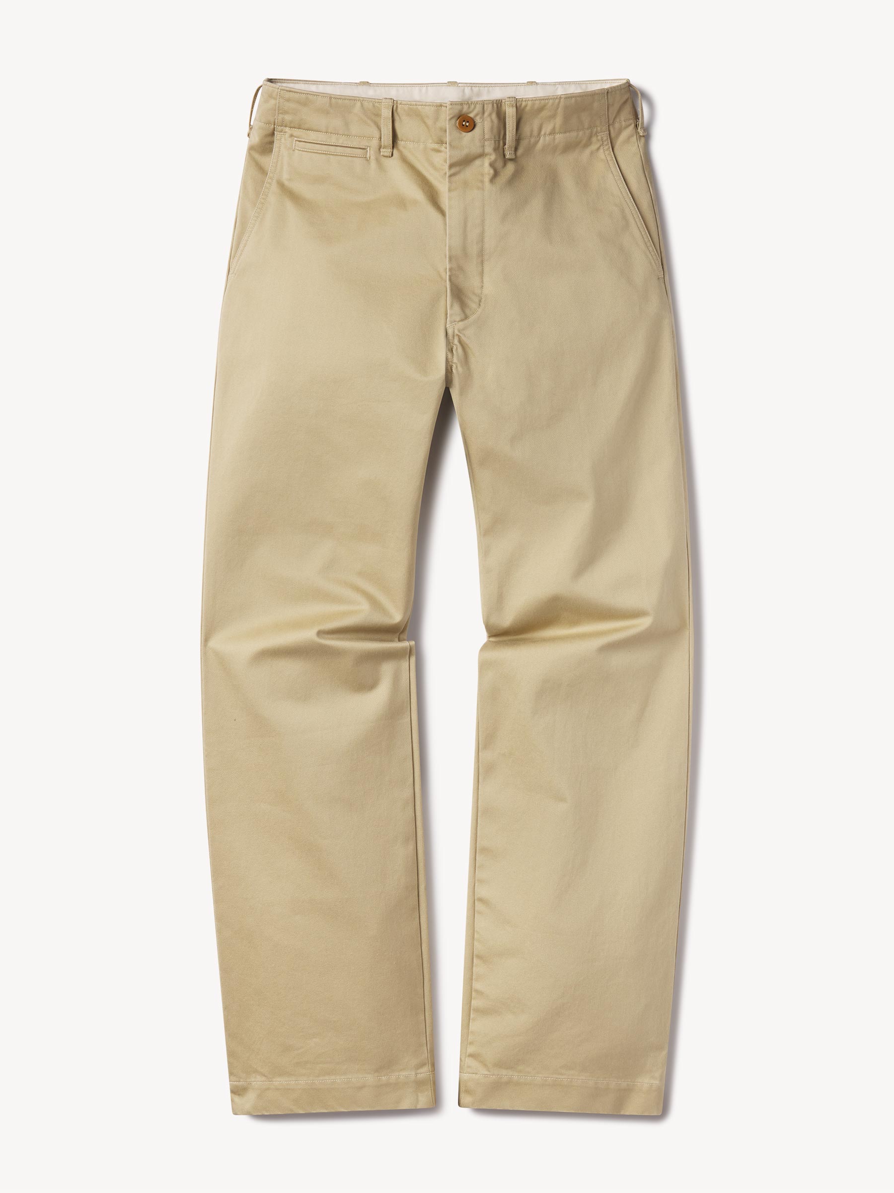 The classic officer’s pant in our Ford Standard fit: mid-rise, straight through the thighs with a taper below the knee. Cut from 9.5 oz cotton twill that has been washed to achieve the same look and feel of vintage service uniforms. Features a “Hollywood” one-piece waistband construction, slash front pockets, buttoned flap back pockets, and a welted coin pocket, natural canvas interior detailing, and real corozo buttons. Garment washed with enzymes for a lived-in feel. Zip fly.