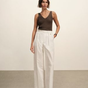 Taking inspiration from 1940s men’s trousers, a wide-leg pleated pant reimagined for modern wear. Cut from lightweight cotton poplin and framed with a 32” inseam and a high-rise. Featuring a button-through waistband extension, a single front coin pocket with button-down flap, and back welt pockets with a single button closure. Finished with corozo buttons and a zipper fly. Garment-washed for a vintage look and feel.