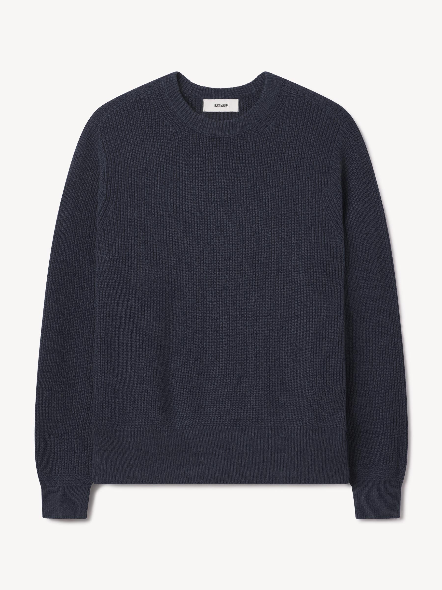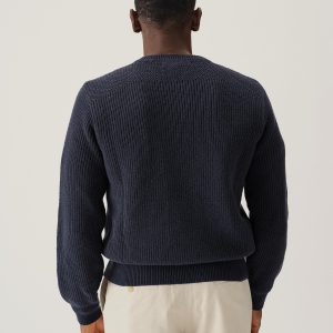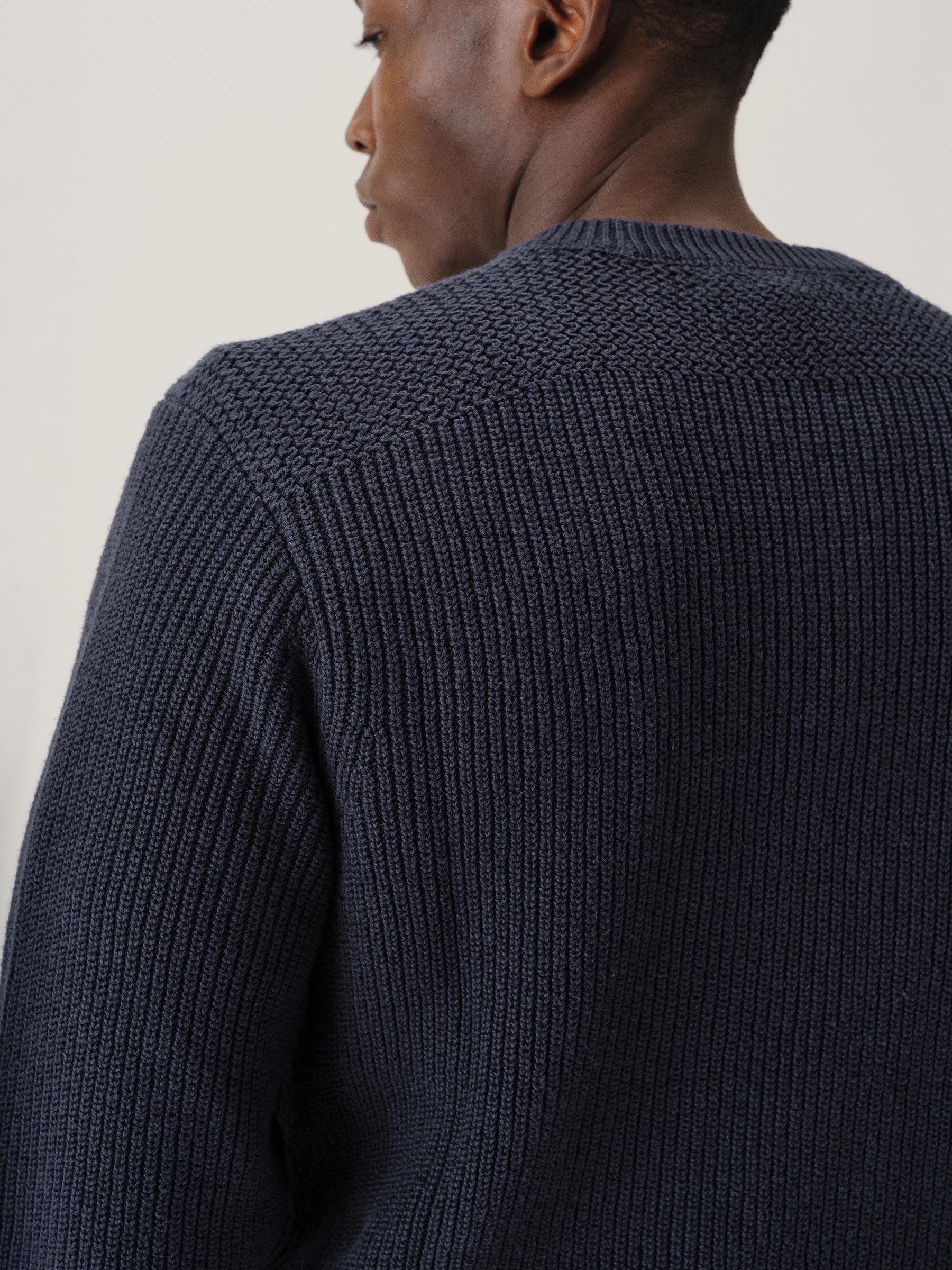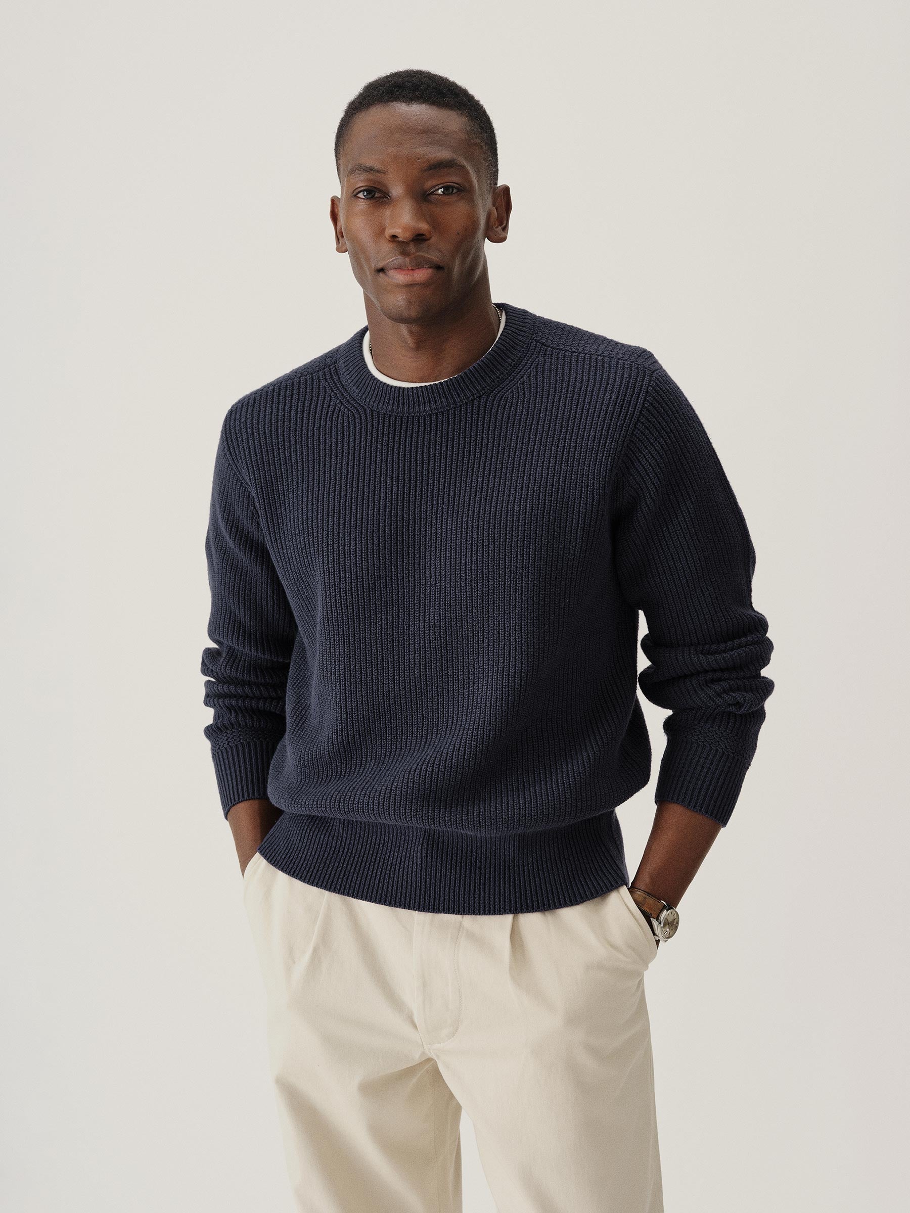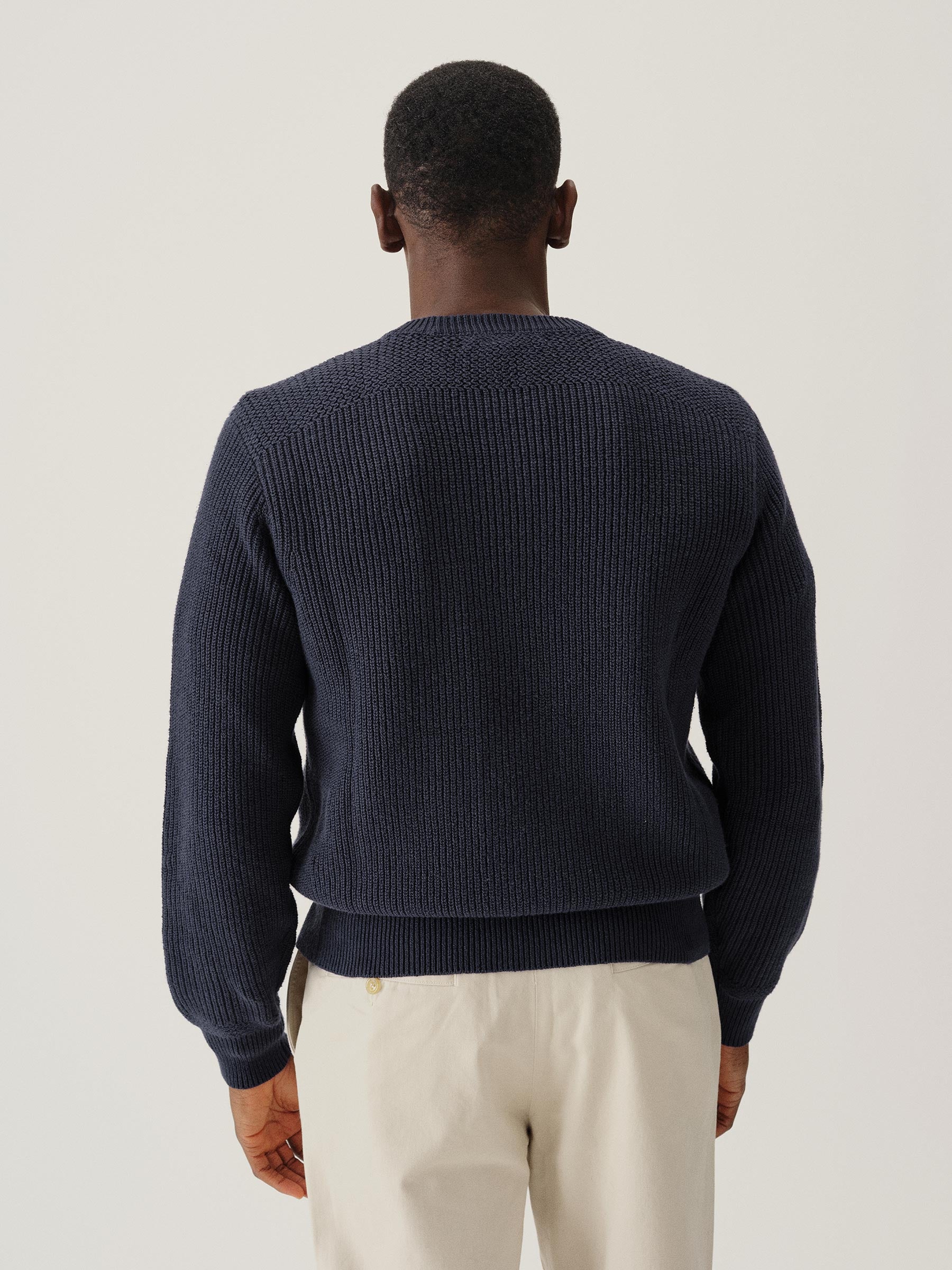 Classic fit crewneck sweater in a homespun textured cotton rib. Constructed with hand-linked seams, double layer ribbing at the collar, and racking stitch detailing at the cuffs.