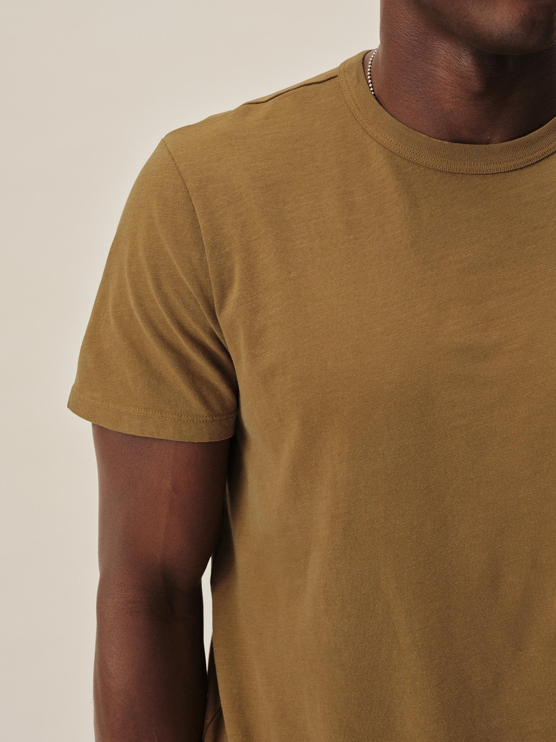 Classic fit short sleeve crewneck tee with a straight hem. Cut from USA-grown 145 GSM cotton jersey with a light slub texture and sewn at BM Knitting Mills in Mohnton, PA. Garment washed with enzymes and softener for a lived-in feel.