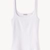 Slim fit ribbed scoop neck tank cut from 295 GSM stretch cotton that holds its shape. 2×2 rib structure—two rows of rib stitch, two rows of jersey stitch—is offset by contrast 1×1 rib at the neck. Constructed with coverstitching throughout and flatlock stitching at the side seams. Garment washed for a lived-in feel.