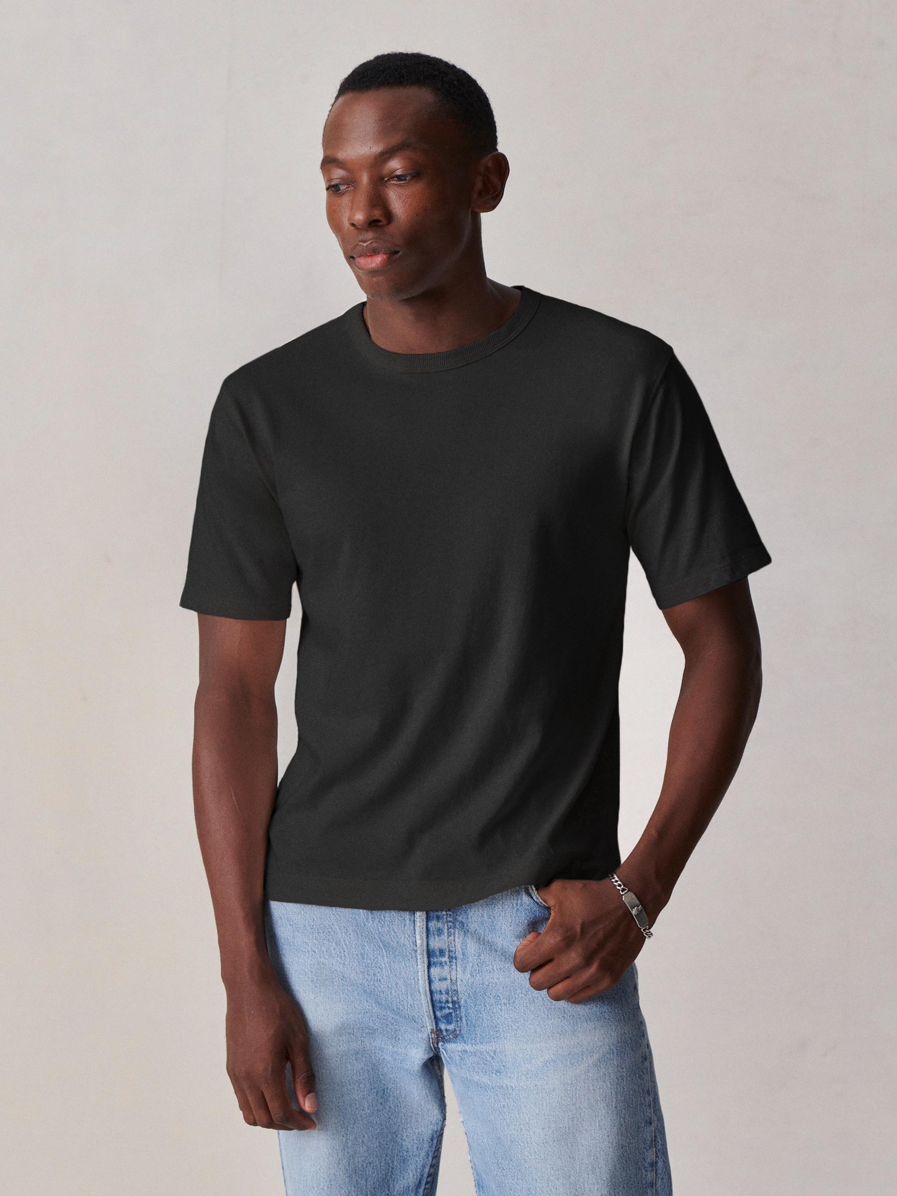 Cut from a midweight 200 GSM USA-grown cotton, developed, milled, and sewn at BM Knitting Mills in Mohnton, PA. This 90s-inspired boxy crewneck tee has a straight hemline, longer sleeves that hit lower on the bicep, and a wide ribbed collar. Bound neck and screen-printed label for comfort, constructed with a split-needle cover stitch at shoulders and armholes. Double-washed for a soft, smooth texture and consistent fit.