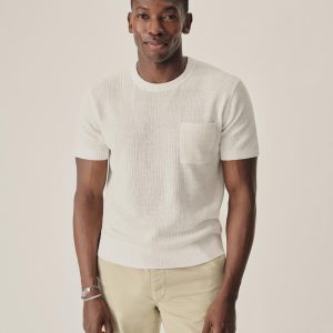 A classic fit tee in a fine knit drop-needle rib construction. Made from 12 gauge yarn-dyed hemp/cotton blend that wicks moisture and breathes easily. Chest pocket with ribbed opening. Finished with a 1×1 rib at collar, cuffs and waistband. A versatile summer layer inspired by vintage rib tees.