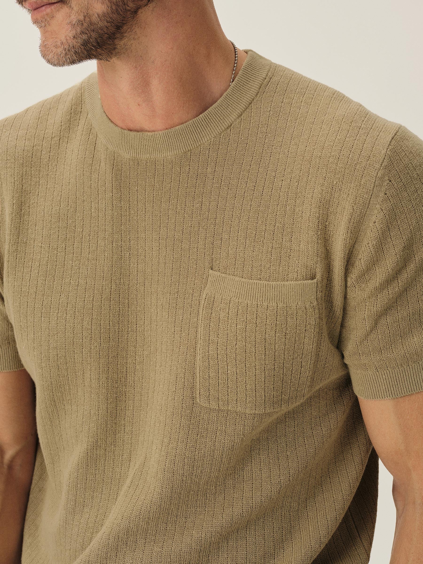 A classic fit tee in a fine knit drop-needle rib construction. Made from 12 gauge yarn-dyed hemp/cotton blend that wicks moisture and breathes easily. Chest pocket with ribbed opening. Finished with a 1×1 rib at collar, cuffs and waistband. A versatile summer layer inspired by vintage rib tees.